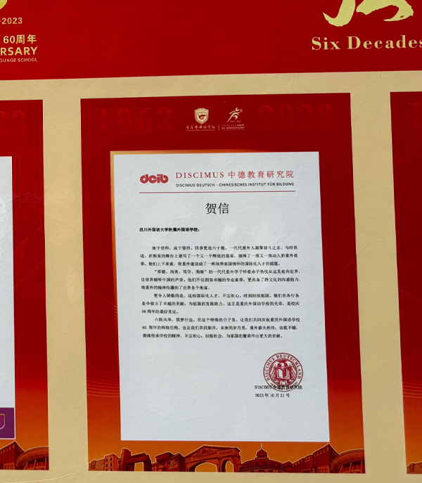 Im Jahr 1963 wurde die Chongqing Foreign Language School (Gymnasium) mit dem Ziel gegründet, eine erstklassige Bildung in Fremdsprachen anzubieten. In den letzten 60 Jahren hat die Schule nicht nur dieses Ziel erreicht, sondern auch eine herausragende Reputation für ihre qualitativ hochwertige Ausbildung aufgebaut. In Vorfreude auf viele weitere Jahre herausragender Bildung und kultureller Bereicherung gratulieren wir der Chongqing Foreign Language School zu ihrem 60. Jubiläum!